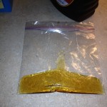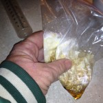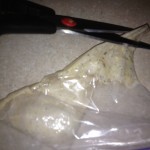 Step 2. Open a ziplock baggie and add your syrup, molasses or whatever you are using to mix the medicine in. Be sure to add the liquid before you add the powder or it will get stuck in the corners of the bag and be difficult to mix. Make sure you have the right amount of liquid. Too much won’t fit in the syringe and too little will make a very thick paste that won’t easily be expelled from the syringe.