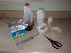 Step 1. Carefully count out the pills into the mortar. Count twice, just to be sure. Grind the pills into a fine powder using the pestle. Make sure no large pieces remain or they may get stuck and clog up the tip of the syringe. If you are mixing two or more medicines at the same time, be sure to ask the vet if it’s ok. We don’t want any weird chemical reactions happening.